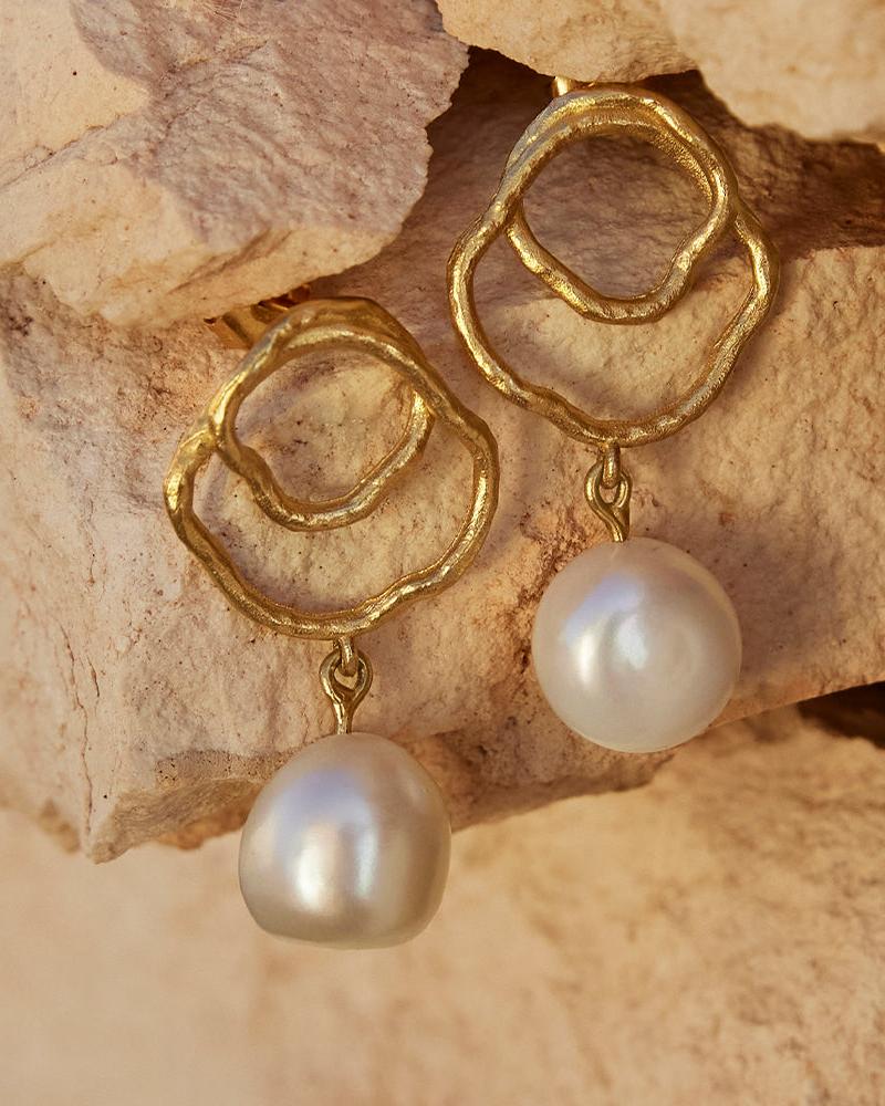 Célaphine – a name that evokes the enchanting lull of the sea, whispered from the ancient lips of the Aquazuran people as they crafted these earrings, a symphony of nacre and shimmering gold. The name itself is a tribute to their moonlit deity, Selá, a goddess of the night, as she casts her tender light like pearls upon the restless sea.