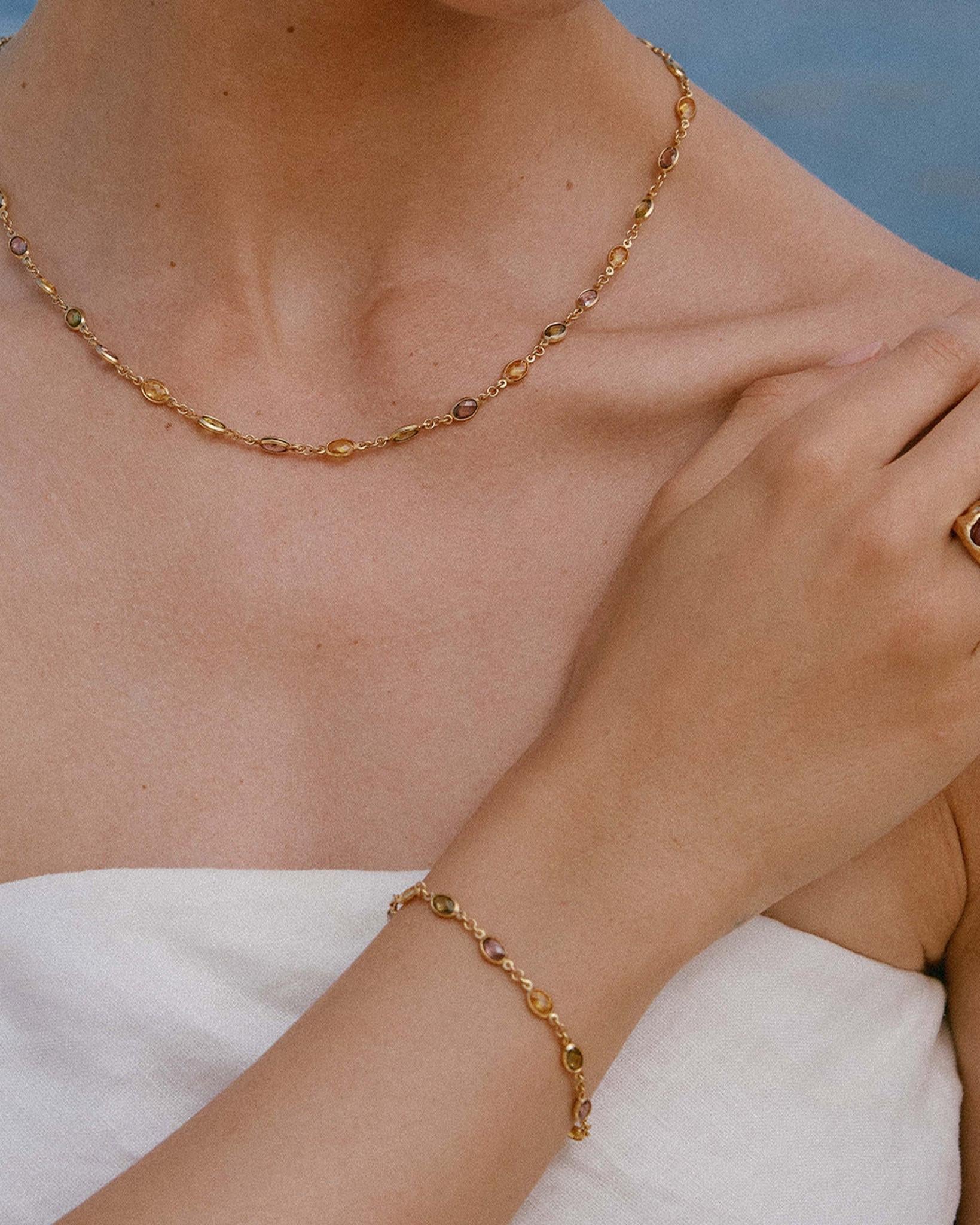 Alternating multicolored stones set on a fine chain, in vibrant shades of deep rosewood, golden yellow, and dark green.