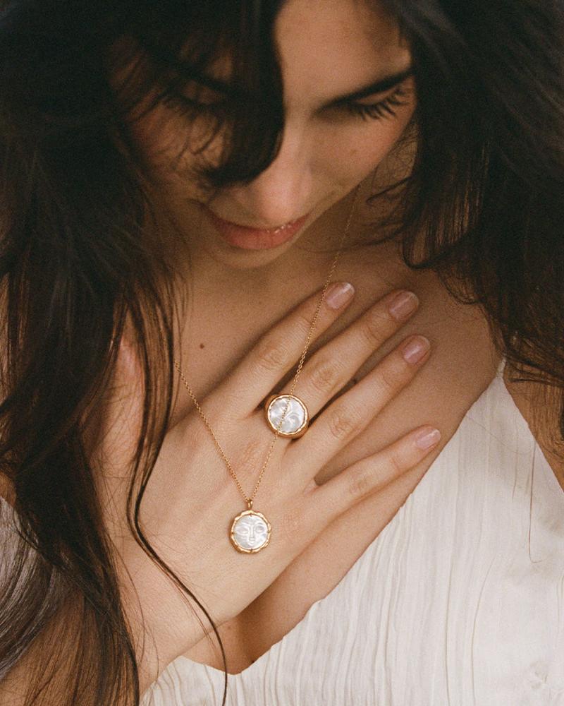 This luminescent mother-of-pearl moonface pendant of our Hëna necklace captures the serene glow of a full moon.