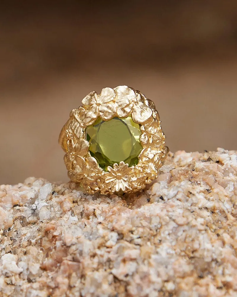 Welcome to our secret garden. Our Hespé chunky ring features a striking green stone, cradled in a bed of flowers. A tribute to summertime and nature in full bloom.