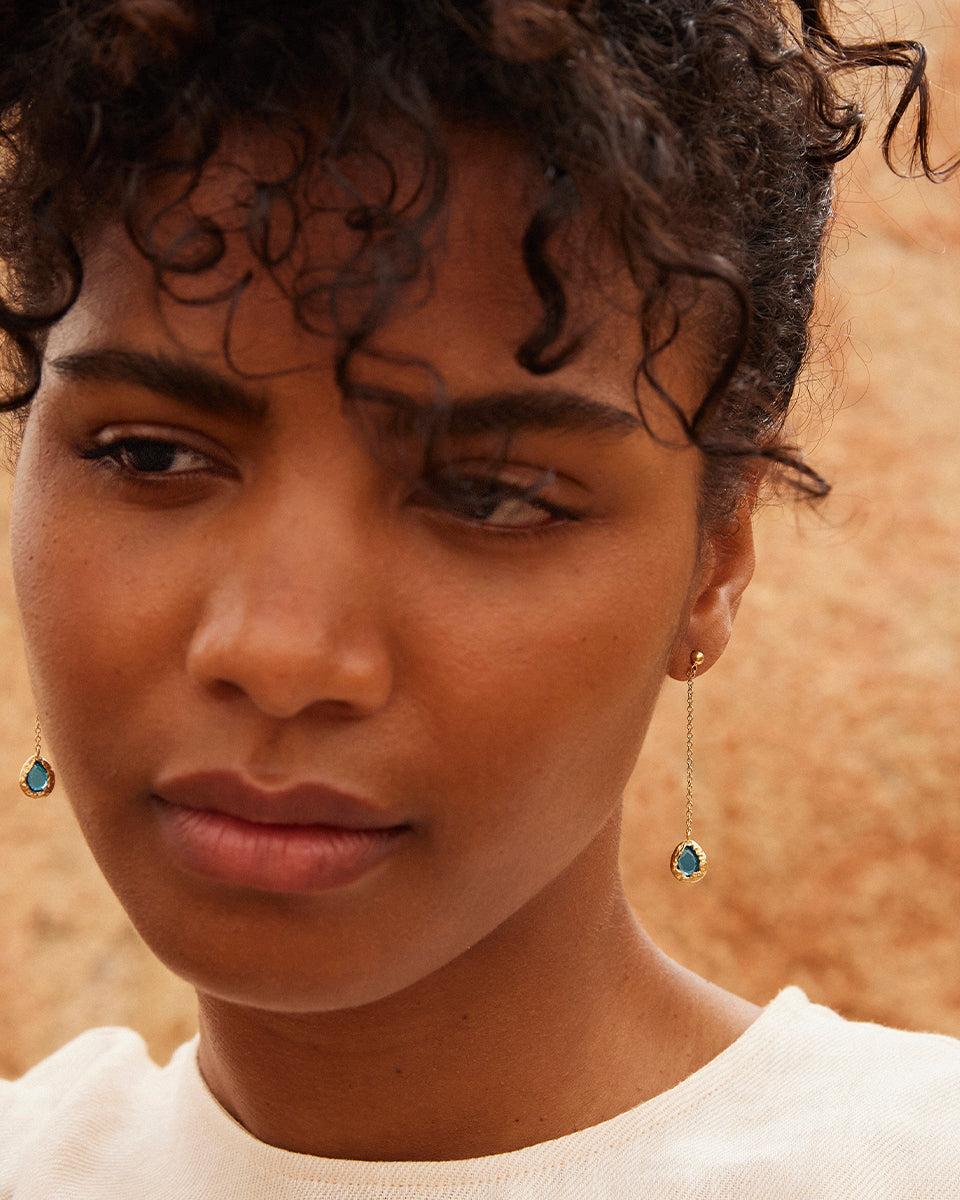 The Lysia long earrings feature drop-shaped pendants dangling from thin chains, each with a blue stone hand-set in textured gold.