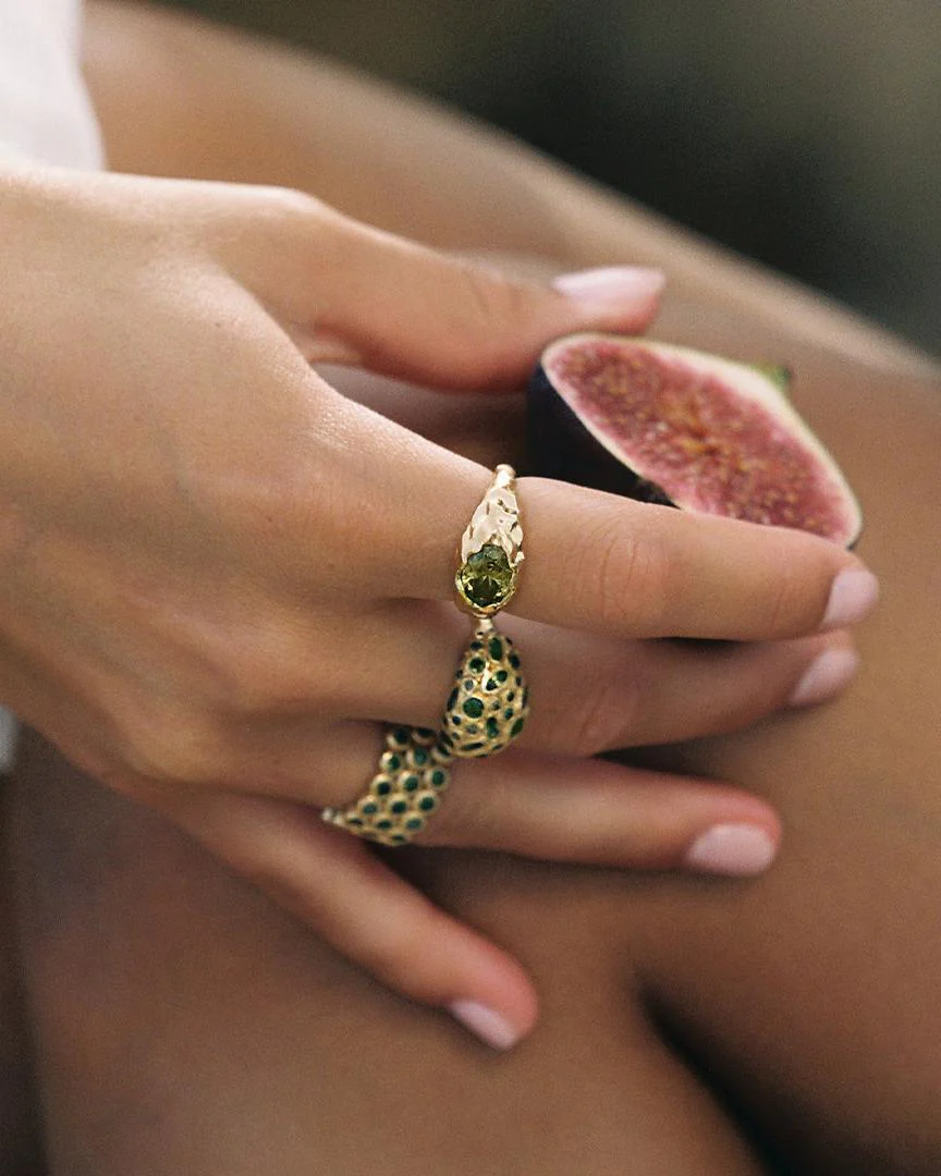 Maria is our bold new creation, with a green stone set in an irregular and textured setting.