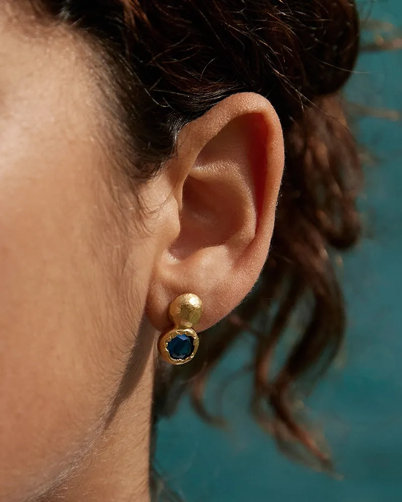 Our Petra earrings are like a starlit night sky. Featuring a delicate night blue stone beautifully contrasting with its gold surroundings, they will add a touch of mystique to any outfit.